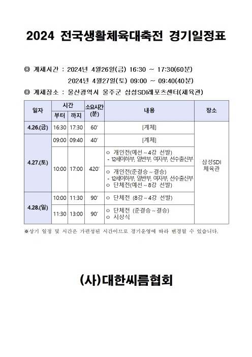 - 1.씨름2024 전국생활체육대축전 대진표pdf.pdf (128.5K) 5회 다운로드 | DATE : 2024-04-23 16:49:41