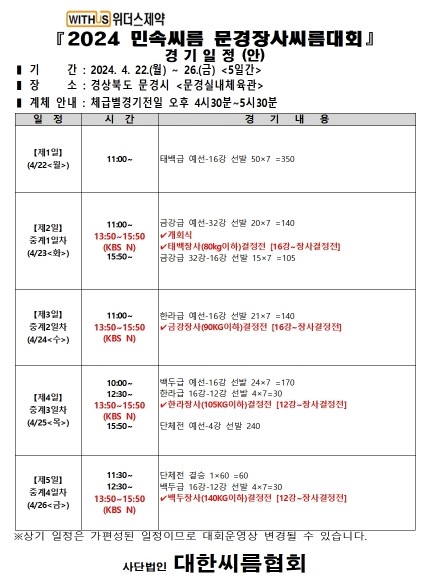 - 2. 2024 문경장사_남자부 개인전 대진표.hwp (67.0K) 0회 다운로드 | DATE : 2024-04-15 14:32:00
