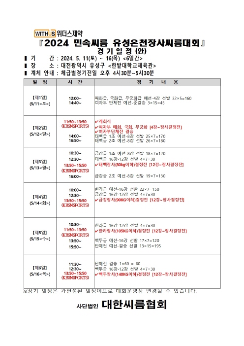 - 2024 유성대회 남자부 체급별 대진표.pdf (119.1K) 0회 다운로드 | DATE : 2024-05-03 15:01:27