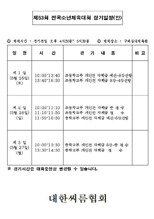 제53회 전국소년체육대회 작성일 24-04-15 12:06 페이지 정보 2024년05월25일 부터 2024년05월27일 까지 작성자경기도씨름협회 조회 1,824회 댓글 0건 본문 이전글 다음글 목록 댓글목록 댓글목록 등록된 댓글이 없습니다.