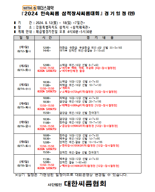 - 2024 삼척대회 남자부 체급별 대진표.pdf (112.7K) 2회 다운로드 | DATE : 2024-08-07 16:15:19