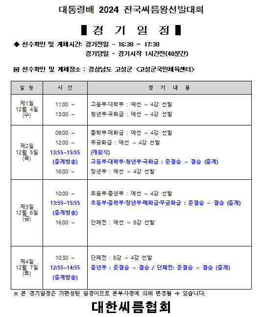 - 대통령배 2024 - 개인전 대진표.hwp (132.0K) 3회 다운로드 | DATE : 2024-11-26 16:12:25