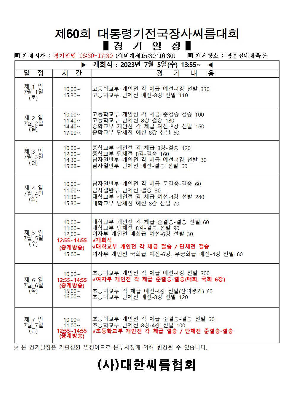 제60회 대통령기전국장사씨름대회 작성일 23-06-22 12:16 페이지 정보 2023년07월01일 부터 2023년07월07일 까지 작성자경기도씨름협회 조회 1,553회 댓글 0건 본문 이전글 다음글 목록 댓글목록 댓글목록 등록된 댓글이 없습니다.